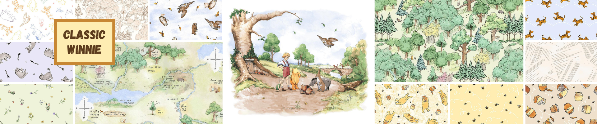 Step into the Hundred Acre Wood with the Classic Winnie collection from Studio E Fabrics. The illustrations of W. A. Dodge fill the prints in this ode to childhood, with Winnie the Pooh and all his friends. Tigger is bouncing with excitement to see the quilts and pillows you will make. Help Eeyore find his tail as you stitch together the book panel for the little one in your life. Piglet, Rabbit, and Owl will be excited to see the variety of projects you create.