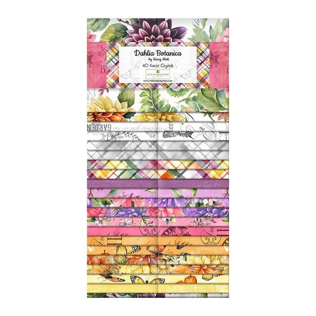 Dahlia Botanica is a vibrant, garden-inspired line featuring large-scale dahlias, packed blossoms, butterflies, and lush greenery in warm pinks, purples, yellows, and oranges, with versatile coordinating plaids and textures. 100% cotton material, 44/45" wide.