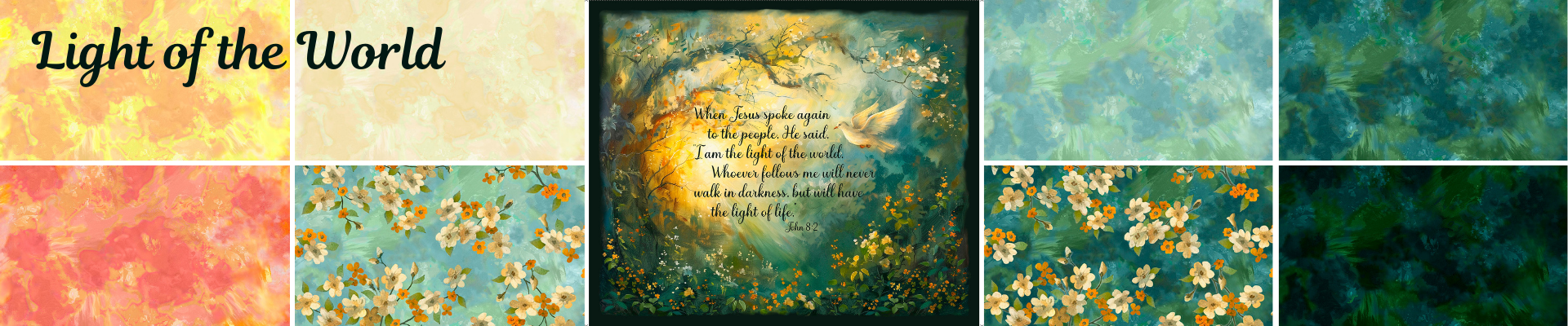 Light of the World by Claudia McKinney for QT Fabrics features a beautiful panel with a scriptural quote from John 8:2. The collection is augmented with Dogwood blooms (symbolic of resurrection, renewl, purity, and hope), and painterly textures in a soothing color pallette in shades of yellow, gold, green, blue, teal, and cream. The collection will resonate with those seeking daily inspiration, and is perfect for projects to celebrate one's faith, comfort the sick, or to create memorable Easter gifts. 100% cotton material, 44/45" wide.