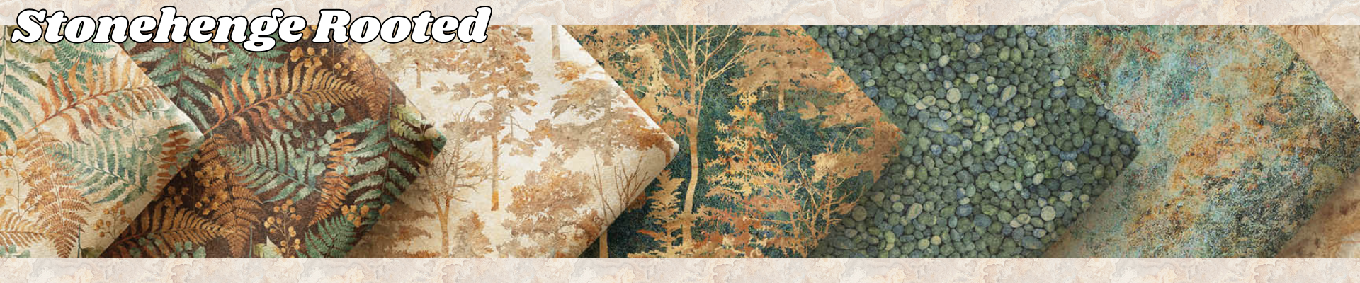 Stonehenge Rooted the latest Stonehenge collection from Linda Ludovico is firmly rooted in nature with trees, foliage, pebbles, and intricate stone textures including marble and agate in classic Stonehenge tradition. Rich autumn shades of rust, tan are complemented by greens and teals crafting eye catching cool warm color contrast. This collection coordinates seamlessly with other Stonehenge collections. 100% cotton material, 43/44" wide.