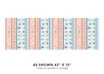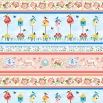 This border stripe features an array of delightful springtime designs with vibrant imagery in horizontal rows (running parallel to the selvedge edges). A strip set features four different rows, each separated with solid color stripes. The first row showcases springtime signs, with text and imagery bordered by various pastel colors. The signs are placed on a dotted pink background and are embellished with springtime flowers. The second row features pink blossoms accented with green leaves, sprigs of ferns, small yellow and white flowers, and occasional bees - all on a light yellow background. The third row consists of colorful birdhouses, birds, butterflies, tulips, and daffodils - all placed on a cloudy blue background. The fourth row showcases a chain of white daisies with yellow centers, embellished with dark green leaves and set on a medium blue background. The set of rows repeats four times.